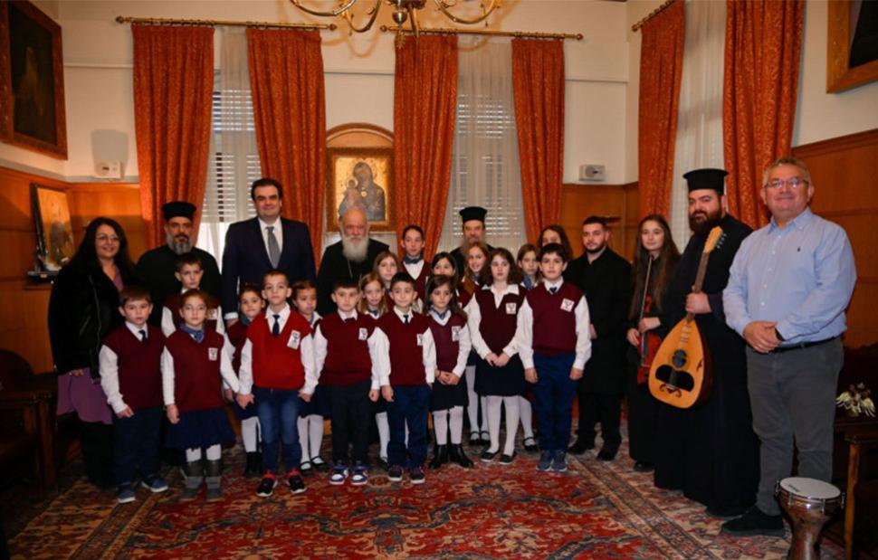 Μετά την κατ’ ιδίαν συνάντησή τους, ο Αρχιεπίσκοπος και ο κ. Πιερρακάκης είχαν την ευκαιρία να ακούσουν τα χριστουγεννιάτικα κάλαντα από ομάδες διάφορων οργανισμών και φορέων.