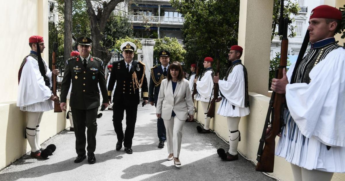 Η κ. Σακελλαροπούλου αντάλλαξε ευχές για το Πάσχα με τους Εύζωνες και τα στελέχη της Προεδρικής Φρουράς.