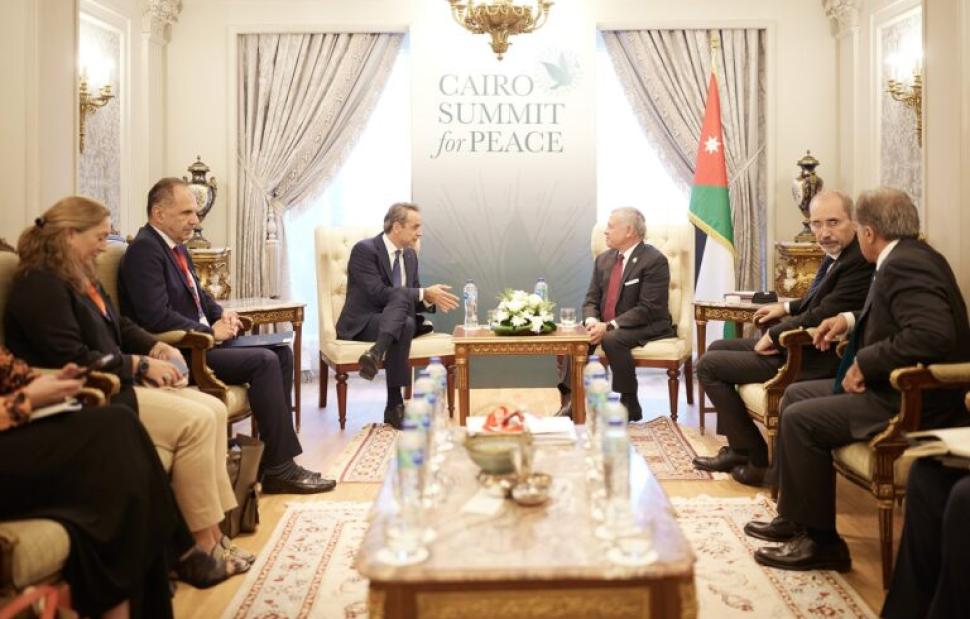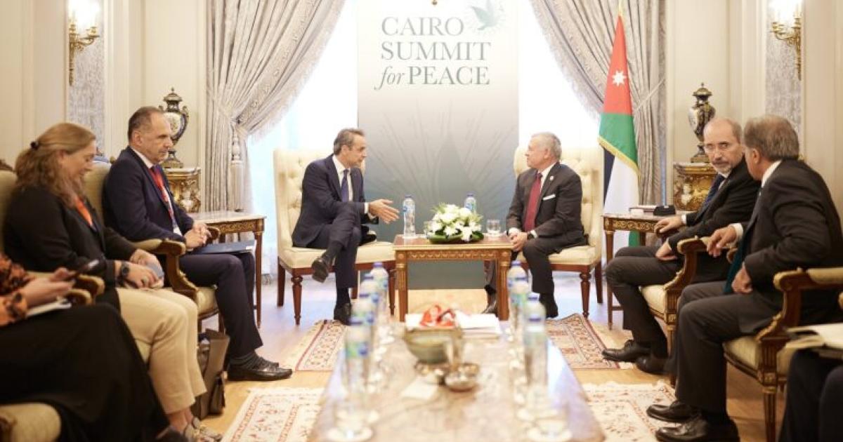 Ο Πρωθυπουργός Κυριάκος Μητσοτάκης συναντήθηκε στο Περιθώριο της «Συνόδου Κορυφής για την Ειρήνη» στο Κάιρο με τον Βασιλιά της Ιορδανίας Abdullah II. Η συνάντηση πραγματοποιήθηκε σε ιδιαίτερα θερμό κλίμα, που αντικατοπτρίζει τις πολύ καλές σχέσεις των δύο χωρών.