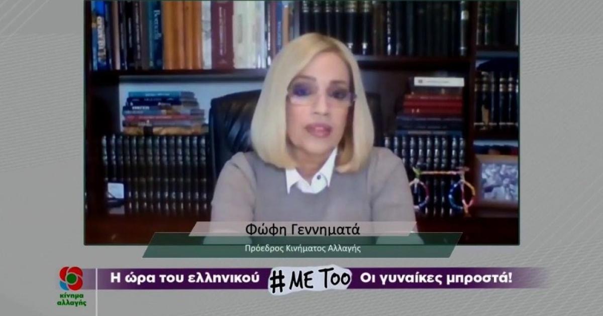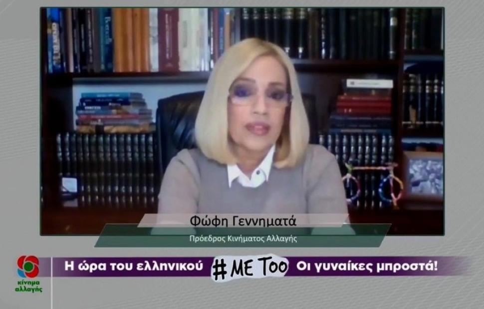 Καμία σιωπή και καμία ανοχή σε αυτές τις πρακτικές. Σε όλους τους χώρους, στον πολιτισμό, στον αθλητισμό, στα Πανεπιστήμια, στους χώρους εργασίας, στην γειτονιά μας. Από εδώ και πέρα το να σπάσουμε τη σιωπή δεν είναι μόνο επιλογή, είναι ευθύνη. Αναλαμβάνουμε νέες πρωτοβουλίες. Δεν σταματάμε εδώ. Συνεχίζουμε τον αγώνα, στηρίζουμε το Ελληνικό metoo». Αυτό ανέφερε στην ομολία της η Πρόεδρος του Κινήματος Αλλαγής Φώφη Γεννηματά.