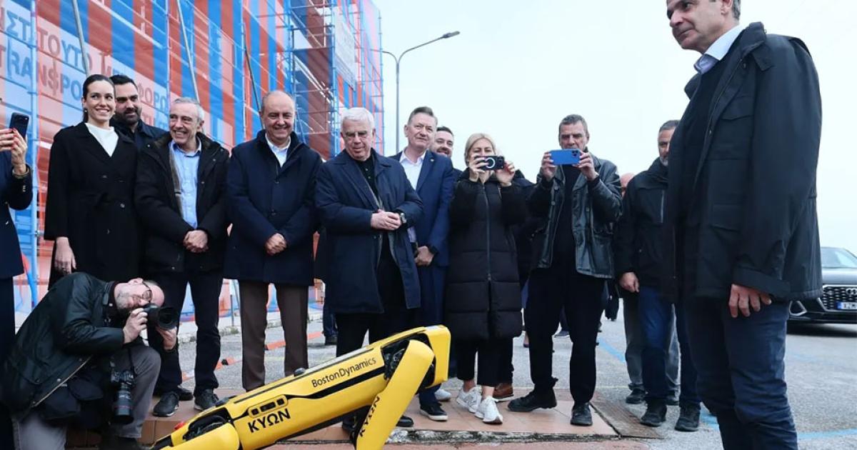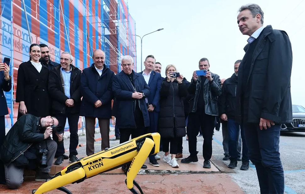 Τον κ. Μητσοτάκη υποδέχθηκαν οι υπεύθυνοι του ΕΚΕΤΑ και του ΙΜΕΤ στην είσοδο του Ινστιτούτου, με μια επίδειξη από τον ρομποτικό σκύλο ΚΥΩΝ.
