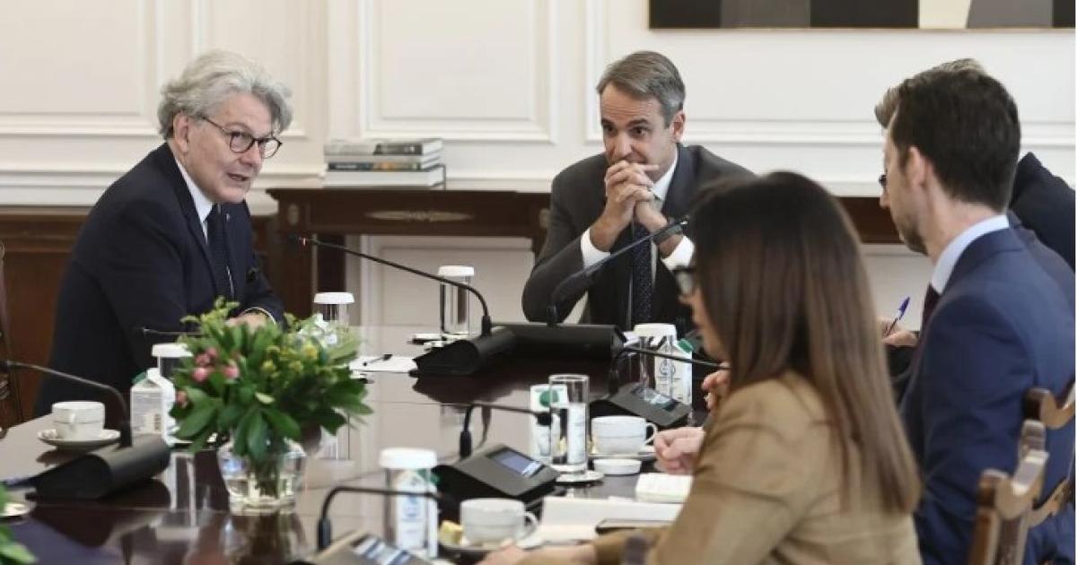 Η ανταγωνιστικότητα της ευρωπαϊκής οικονομίας, της Ενιαίας Αγοράς και της ευρωπαϊκής βιομηχανικής πολιτικής, με έμφαση στην άμυνα, βρέθηκε στο επίκεντρο της συνάντησης του Πρωθυπουργού, Κυριάκου Μητσοτάκη, με τον επίτροπο της Ευρωπαϊκής Ένωσης αρμόδιο για την Εσωτερική Αγορά, Τιερί Μπρετόν.