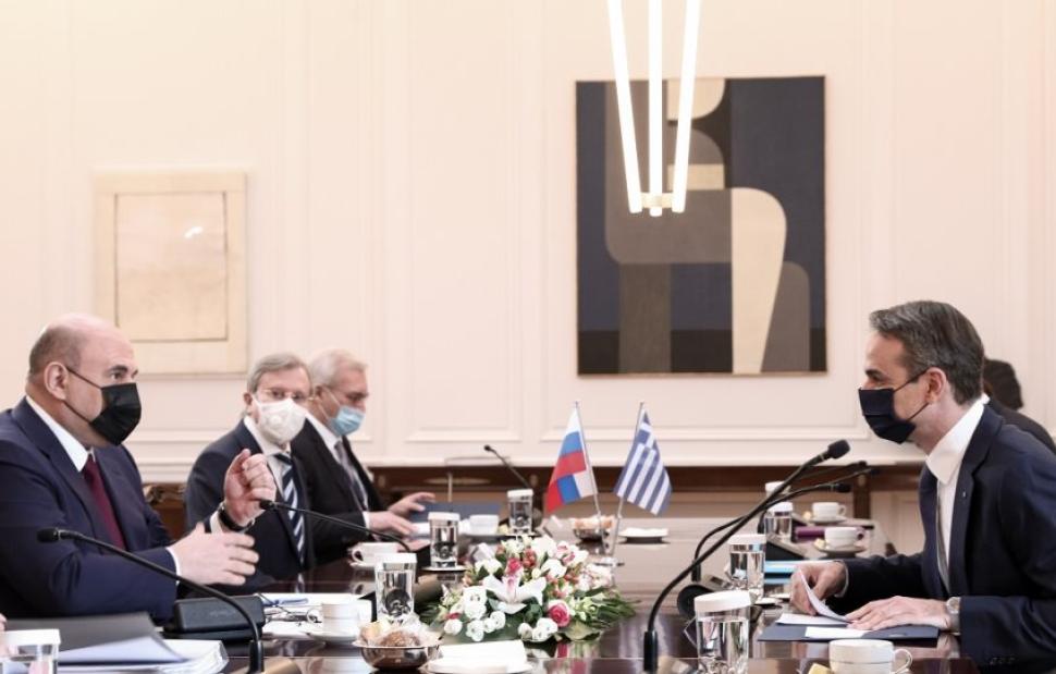 Στις δηλώσεις του, ο Κυριάκος Μητσοτάκης, μετά τη συνάντηση με τον Ρώσο πρωθυπουργό, ανέφερε μεταξύ άλλων: «Οι σχέσεις των δυο χωρών έρχονται από πολύ μακριά και μπορούν να πάνε και πολύ μακριά. Στη Ρωσία μεγαλούργησε ο ευεργέτης μας, Ιωάννης Βαρβάκης και από εκεί ξεκίνησε ο πρώτος κυβερνήτης μας, Ιωάννης Καποδίστριας. Η συμμετοχή της Ρωσίας, με τη Βρετανία και τη Γαλλία στη Ναυμαχία του Ναυαρίνου, σήμαναν τη νίκη των Ελλήνων. Ιστορικοί οι δεσμοί των λαών μας, στις ιστορικές δοκιμασίες της ανθρωπότητας βρεθήκαμε μαζί. Η Ρωσία αποτελεί σοβαρό παράγοντα της ευρωπαϊκής ασφάλειας, η οποία οφείλει να οικοδομείται μέσω συνεργατικών και όχι ανταγωνιστικών σχέσεων. Δεν ξεχνάμε τη σταθερή υποστήριξη της ρωσικής δημοκρατίας σε μια λύση ενιαίου διζωνικού κράτους για το Κυπριακό και την προσήλωσή σας στο Διεθνές Δίκαιο και στο Δίκαιο της Θάλασσας για την Ανατολική Μεσόγειο. Κοινή μας προτεραιότητα η αντιμετώπιση της πανδημίας, εξετάσαμε τρόπους να θέσουμε σε κίνηση τις ροές Ρώσων επισκεπτών στη χώρα μας».