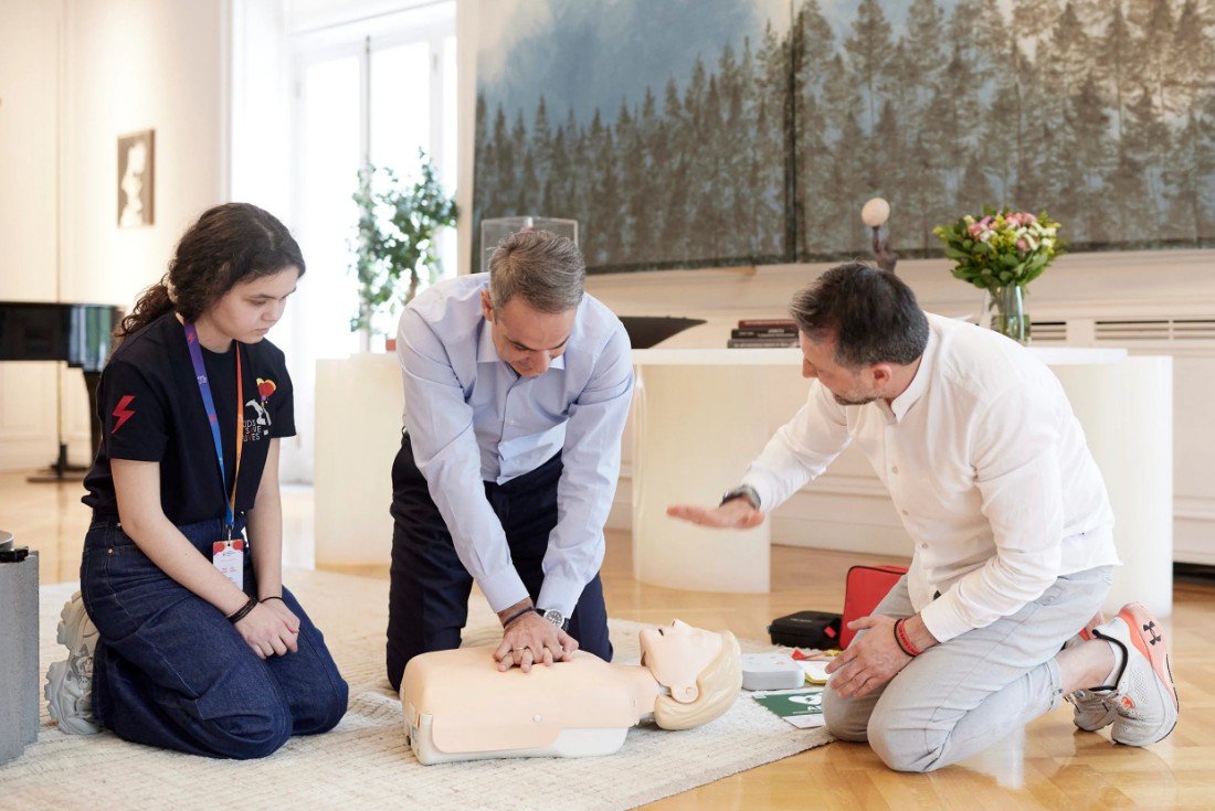 Ο Κυριάκος Μητσοτάκης είχε την ευκαιρία να παρακολουθήσει επίδειξη ΚΑΡΠΑ από τη Μαρία, τη νεότερη εκπαιδεύτρια της Ευρώπης, και να ενημερωθεί για τις ψηφιακές εφαρμογές της οργάνωσης που έχει καταρτίσει και τον εθνικό χάρτη απινιδωτών.