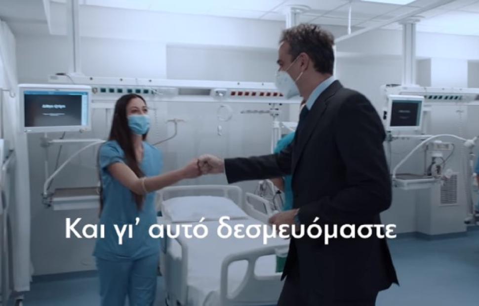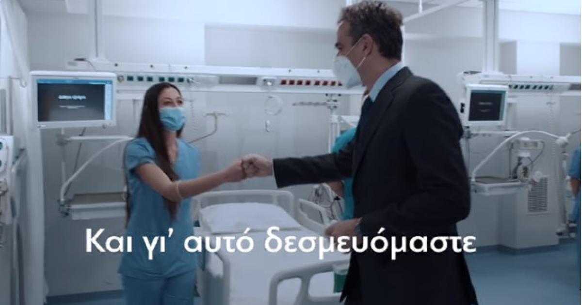 Στο βίντεο παρουσιάζεται ο Πρωθυπουργός και πρόεδρος της Νέας Δημοκρατίας να επισκέπτεται νοσοκομεία και νοσηλευτές, αλλά και διασώστες του ΕΚΑΒ.