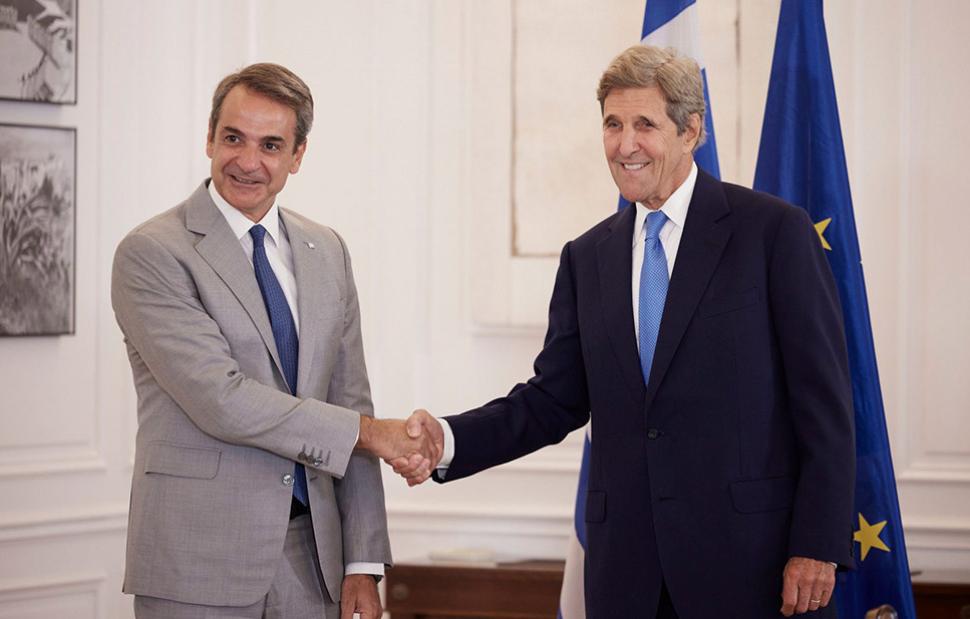 Ο Πρωθυπουργός Κυριάκος Μητσοτάκης συναντήθηκε σήμερα, στο Μέγαρο Μαξίμου, με τον Ειδικό Απεσταλμένο του Προέδρου των ΗΠΑ για το Κλίμα, Τζον Κέρι, ο οποίος πραγματοποιεί επίσκεψη στην Ελλάδα.