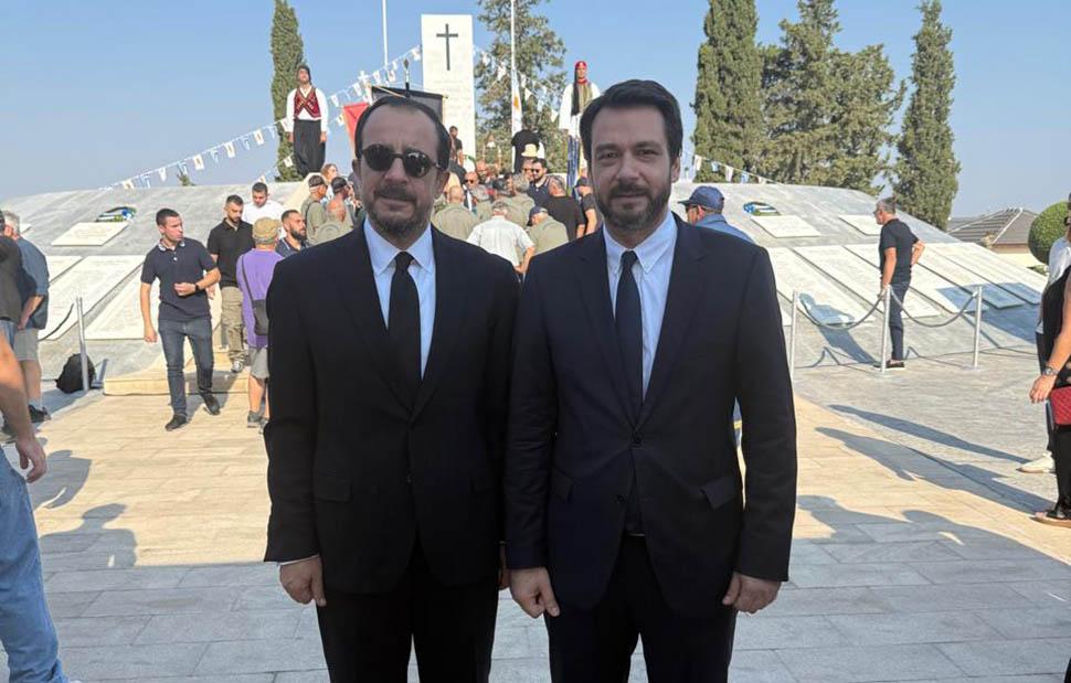 Την Κυριακή, ανήμερα της μαύρης επετείου της εισβολής, συμμετείχε στην επιμνημόσυνη δέηση στον Τύμβο της Μακεδονίτισσας και στο μνημόσυνο των πεσόντων στον Καθεδρικό Ναό του Αποστόλου Βαρνάβα, αποτίοντας φόρο τιμής στους ήρωες της ελευθερίας Η ελληνική αντιπροσωπεία έγινε δεκτή από τον Μακαριώτατο Αρχιεπίσκοπο Κύπρου και Νέας Ιουστινιανής, Γεώργιο, σε μια συνάντηση με έντονο συμβολισμό και εγκάρδιο κλίμα. Ενώ, το απόγευμα, παραβρέθηκε στην επίσημη εκδήλωση για τις μαύρες επετείους του πραξικοπήματος και της τουρκικής εισβολής στο Προεδρικό Μέγαρο της Κυπριακής Δημοκρατίας, όπου επιβεβαιώθηκε η κοινή στάση Αθήνας και Λευκωσίας απέναντι σε κάθε αποσχιστική πρακτική που αντιβαίνει στο Διεθνές Δίκαιο.