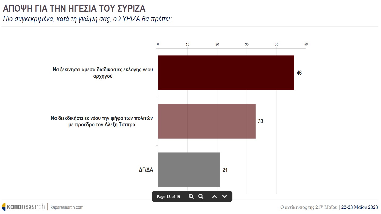 Μετά τη συντριπτική ήττα του ΣΥΡΙΖΑ στις εκλογές της 21ης Μαΐου οι ψηφοφόροι πιστεύουν σε ποσοστό 46% πως θα πρέπει να ξεκινήσει άμεσα διαδικασίες διαδοχής του Αλέξη Τσίπρα και εκλογής νέου αρχηγού. Ενώ σε ποσοστό 33% υποστηρίζουν πως θα πρέπει ο ΣΥΡΙΖΑ να διεκδικήσει εκ νέου την ψήφο των πολιτών με πρόεδρο τον Αλέξη Τσίπρα.