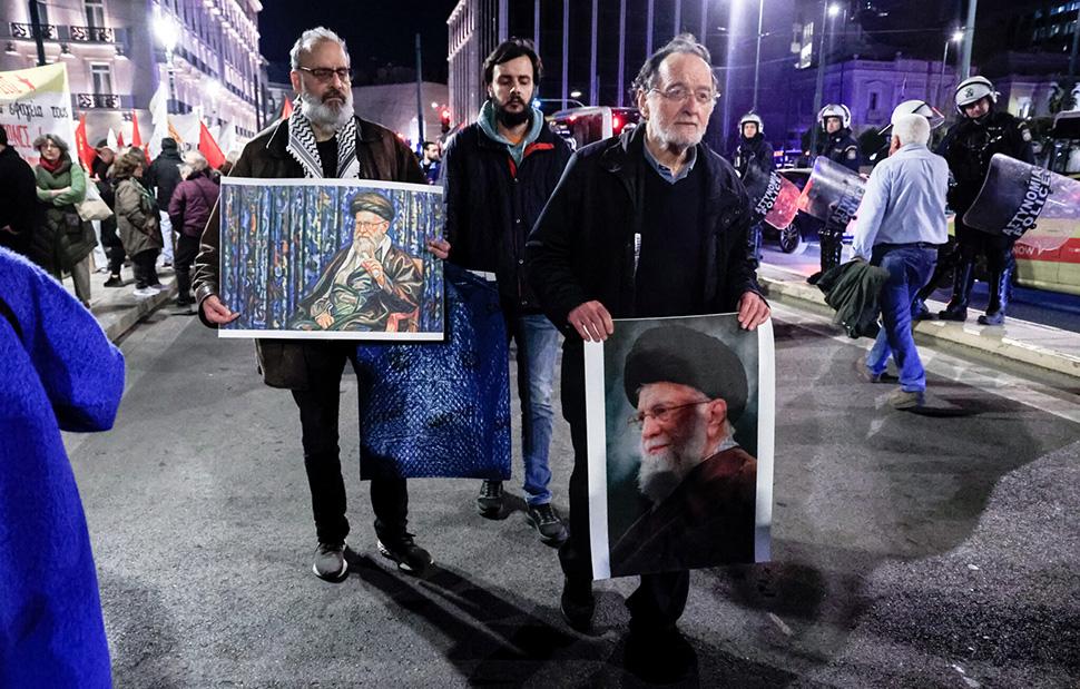 Ο φωτογραφικός φακός κατέγραψε τον κ. Λαφαζάνη με ανάμεσα στους διαδηλωτές, να κρατά μια μεγάλη εικόνα του ανώτατου θρησκευτικού ηγέτη του Ιράν Αγιατολάχ Αλί Χαμενεΐ που σκοτώθηκε την πρώτη ημέρα του πολέμου, σε κοινή επιχείρηση των ΗΠΑ με το Ισραήλ.