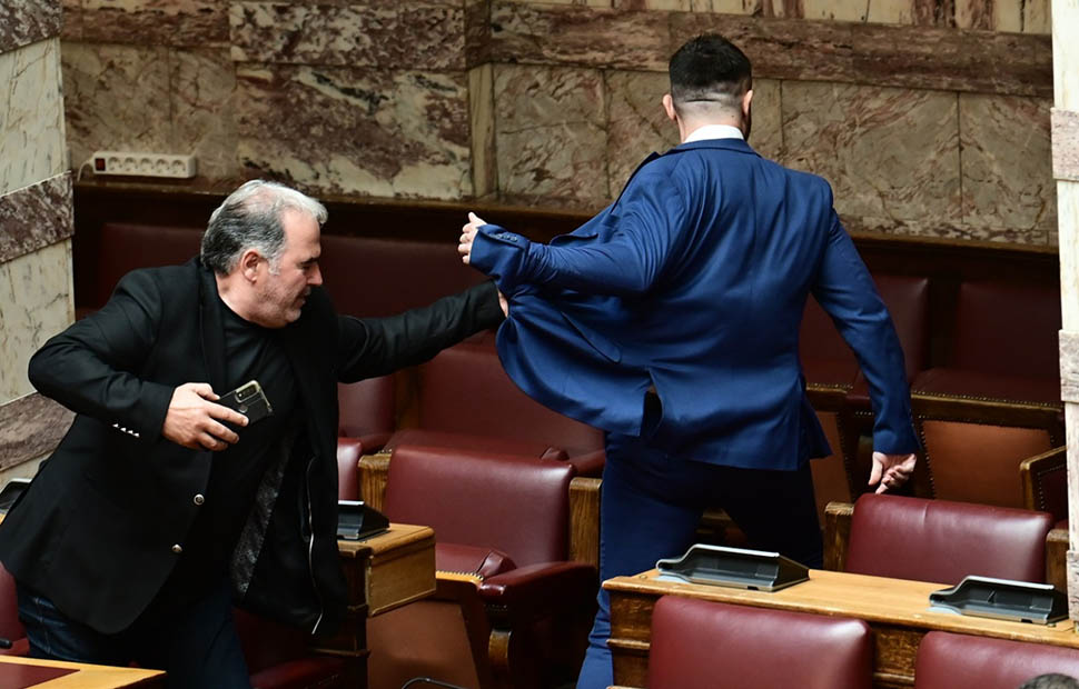Άλλοι βουλευτές επιχείρησαν να σταματήσουν τον Κωνσταντίνο Φλώρο ο οποίος μετά τη γροθιά που έριξε επιχείρησε να φύγει από την ολομέλεια.