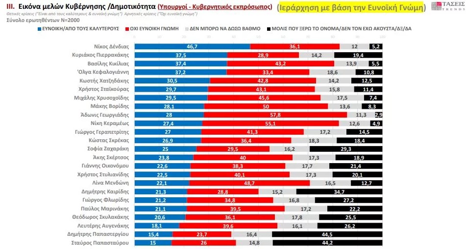Σύμφωνα με την έρευνα, δημοφιλέστεροι υπουργοί είναι ο υπουργός Εθνικής Άμυνας Νίκος Δένδιας με 46,7%, ο υπουργός Παιδείας Κυριάκος Πιερρακάκης με 37,5%, ο υπουργός Πολιτικής Προστασίας Βασίλης Κικίλιας με 37,4%, η Όλγα Κεφαλογιάννη με 37,2%, ο υπουργός Εθνικής Οικονομίας Κωστής Χατζηδάκης με 30,5%, ο Χρήστος Σταϊκούρας με 29,7% και ο Μιχάλης Χρυσοχοΐδης με 29,5%.