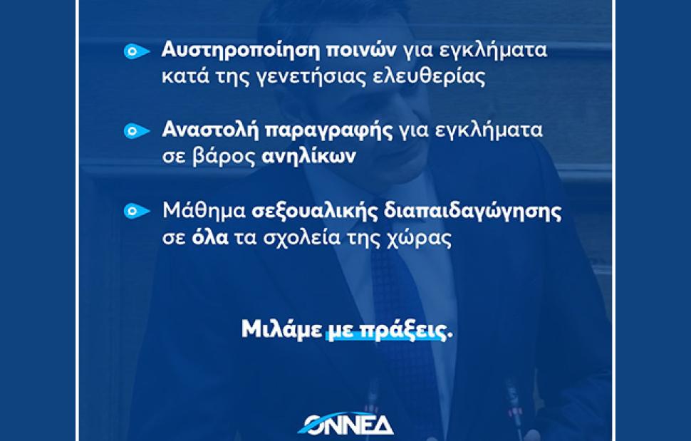 Πριν από μερικές ημέρες, ο πρόεδρος της ΟΝΝΕΔ Παύλος Μαρινάκης, συναντήθηκε με τον υπουργό Δικαιοσύνης Κώστα Τσιάρα, καταθέτοντάς του τις προτάσεις της Οργάνωσης για αυστηροποίηση του νομοθετικού πλαισίου για τα εγκλήματα κατά της γενετήσιας ελευθερίας. Μεταξύ άλλων ζητήσαμε αύξηση των ποινών, ιδίως για πράξεις σε βάρος ανήλικων θυμάτων, αλλά και ευρύτερα αποκατάσταση των στρεβλώσεων που εισήγαγε με τον Ποινικό Κώδικα που θέσπισε η προηγούμενη κυβέρνηση ΣΥΡΙΖΑ-ΑΝΕΛ.