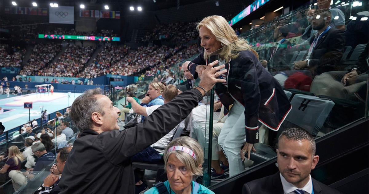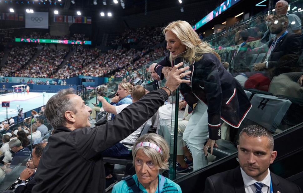 Στο περιθώριο του αγώνα του Έλληνα πρωταθλητή, ο Κυριάκος Μητσοτάκης συνάντηση στις εξέδρες του σταδίου, τη σύζυγο του Τζο Μπάιντεν, Τζιλ, με την οποία είχε θερμό χαιρετισμό.