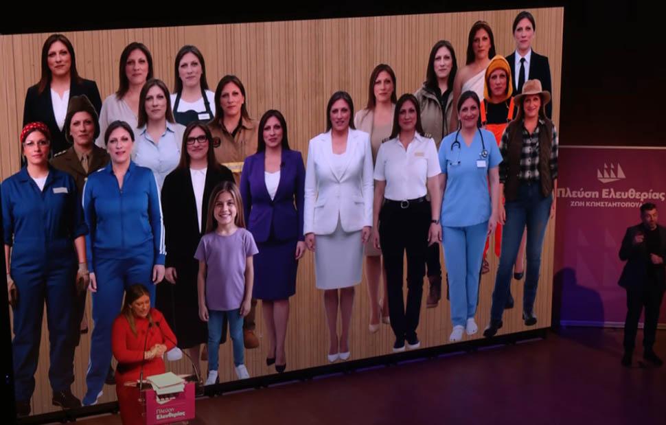 Και αυτό διότι την ώρα που η πρόεδρος της Πλεύσης Ελευθερίας παρουσίασε τους άξονες του προγράμματος σε διάφορους τομείς ακριβώς πίσω της μέσα από ένα τεράστιο video wall εμφανίζονταν η ίδια ντυμένη ανάλογα με τον τομέα που αναφερόταν.