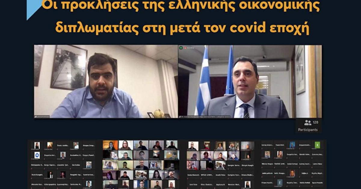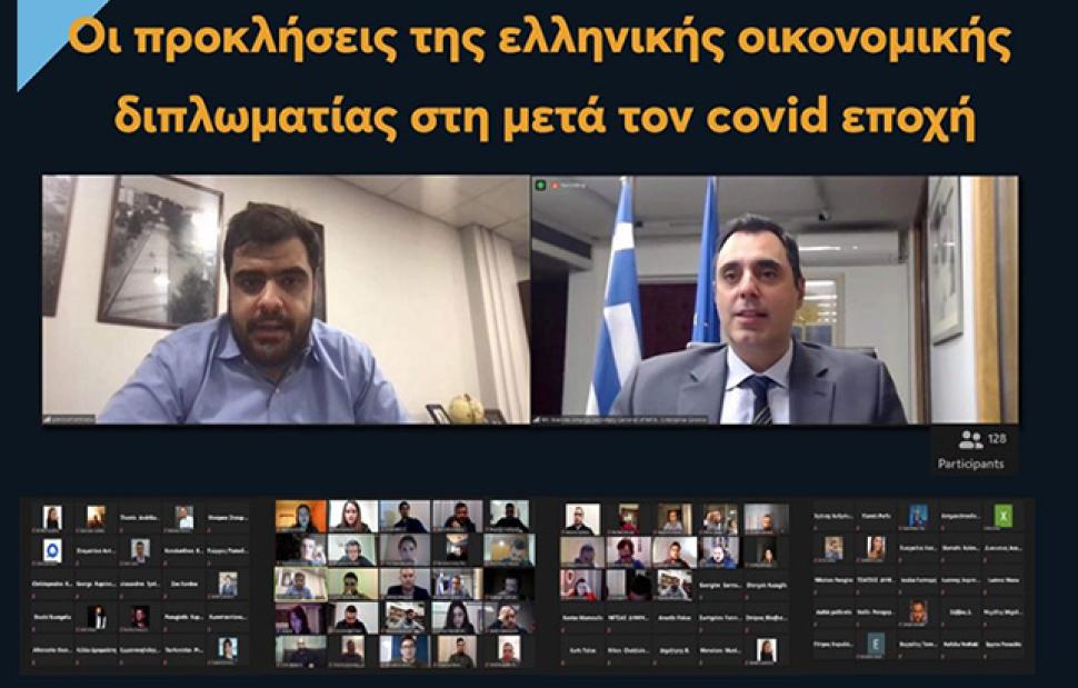 Προσκεκλημένος και κεντρικός ομιλητής ήταν ο Γενικός Γραμματέας Διεθνών Οικονομικών Σχέσεων και Εξωστρέφειας του Υπουργείου Εξωτερικών και Πρόεδρος της Enterprise Greece Γιάννης Σμυρλής, ο οποίος συνομίλησε με τα στελέχη της ΟΝΝΕΔ για το σημαίνοντα ρόλο της οικονομικής διπλωματίας, μιλώντας για τις εξελίξεις στον τομέα και απαντώντας στις ερωτήσεις τους. Χαιρετισμό απηύθυνε ο Πρόεδρος της ΟΝΝΕΔ Παύλος Μαρινάκης, ενώ τη συζήτηση συντόνισε ο αν. Υπεύθυνος Πολιτικής Ακαδημίας Γρηγόρης Μπεκατώρος.
