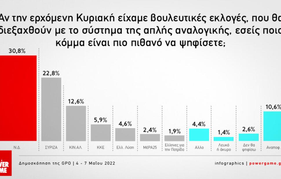 Προβάδισμα 8 ποσοστιαίων μονάδων διατηρεί η Νέα Δημοκρατία έναντι του ΣΥΡΙΖΑ, με απώλεια μιας ποσοστιαίας μονάδας σε σχέση με την προηγούμενη μέτρηση του Οικονομικού Βαρόμετρου της GPO για το powergame.gr, την ώρα που ο ΣΥΡΙΖΑ εμφανίζει άνοδο 0,6% σε σχέση με το ίδιο διάστημα. Συγκεκριμένα, η Νέα Δημοκρατία προηγείται με 30,8% (έναντι 31,8% της μέτρησης του Μαρτίου) με τον ΣΥΡΙΖΑ να συγκεντρώνει το 22,8% (22,2%).