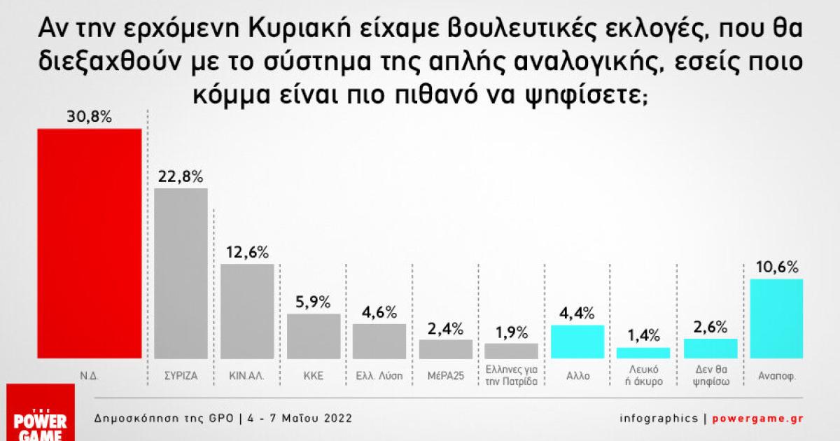 Οι συσχετισμοί αυτοί -κυρίως σε ό,τι αφορά στα ποσοστά της κυβερνητικής παράταξης-είναι φανερό ότι επηρεάζονται από το μεγάλο κύμα ακρίβειας και πληθωρισμού, σε συνδυασμό με τις μεγάλες ανησυχίες της κοινής γνώμης για τη συνεχιζόμενη ρωσική εισβολή στην Ουκρανία και τις επιπτώσεις της. Ωστόσο, οι απώλειες της ΝΔ συνοδεύονται από μια στασιμότητα του ΣΥΡΙΖΑ καθώς και με μια διασπορά ψήφων προς μικρότερα κόμματα. Οι μεταβλητές της δημοσκόπησης, προς το παρόν τουλάχιστον, δείχνουν μεταβολές αλλά όχι ανατροπές συσχετισμών δυνάμεων.