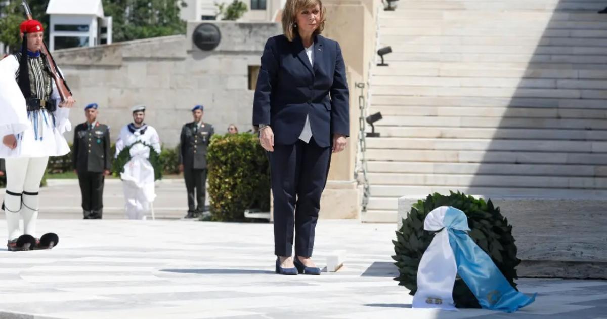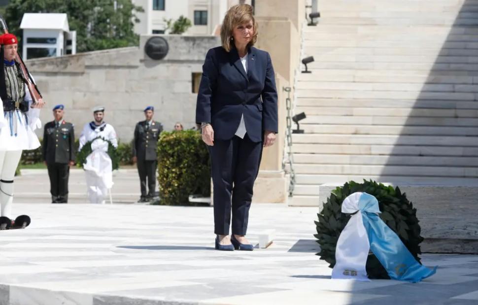 Η Κατερίνα Σακελλαροπούλου παρέστη στο Αρχιερατικό Μνημόσυνο για τους πεσόντες κατά το πραξικόπημα και την τουρκική εισβολή στην Κύπρο το 1974, στον Καθεδρικό Ναό Αθηνών και, στη συνέχεια, κατέθεσε στεφάνι στο Μνημείο του Αγνώστου Στρατιώτη.