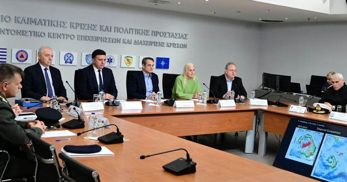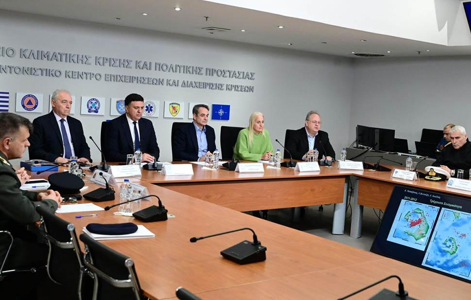 Έκτακτη σύσκεψη υπό τον πρωθυπουργό Κυριάκο Μητσοτάκη πραγματοποιήθηκε στο Υπουργείο Κλιματικής Κρίσης και Πολιτικής Προστασίας, για τα γεωλογικά φαινόμενα και τα μέτρα προστασίας στη Σαντορίνη και τη θαλάσσια περιοχή μεταξύ Σαντορίνης και Αμοργού.
