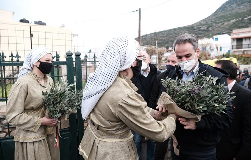 Σε συνομιλία του με τον δήμαρχο, Δημήτρη Καρύδη, ο Κυριάκος Μητσοτάκης ανέφερε: «Θέλουμε να είστε ασφαλείς, θέλουμε να είστε υγιείς και βέβαια, με την ευκαιρία, σε κάθε επίσκεψή μας είναι εδώ και οι αρμόδιοι υπουργοί, ο υπουργός Ναυτιλίας και Νησιωτικής Πολιτικής, ο αναπληρωτής υπουργός Εσωτερικών, ο γενικός γραμματέας Υποδομών, για να κάνουμε και μια επισκόπηση των εκκρεμοτήτων που υπάρχουν, των θεμάτων που μπορούμε να λύσουμε. Και -όπως ξέρεις- είμαστε αποτελεσματική κυβέρνηση, μας αρέσει να λύνουμε προβλήματα και να ερχόμαστε στη συνέχεια να βλέπουμε αυτά που έχουμε κάνει, να μιλάμε λιγότερο και να πράττουμε περισσότερο. Οπότε είναι και μια ευκαιρία να μας μιλήσετε για τα προβλήματα του νησιού».