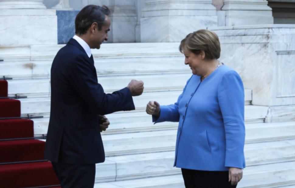 Η Άνγκελα Μέρκελ επέλεξε να περπατήσει από το Προεδρικό Μέγαρο έως το Μέγαρο Μαξίμου, όπου την περίμενε ο Κυριάκος Μητσοτάκης στα σκαλιά.