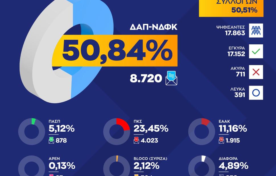 Σε ποσοστό που κινείται στα επίπεδα του 50% βρίσκεται η ΔΑΠ-ΝΔΦΚ μετά την ολοκλήρωση της καταμέτρησης στα μισά τμήματα σε όλη την επικράτεια.