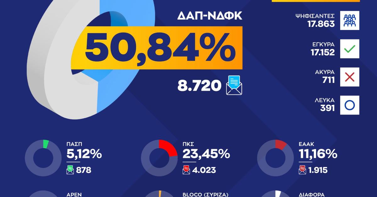 Συγκεκριμένα, η ΔΑΠ-ΝΔΦΚ λαμβάνει ποσοστό 50,84 % .