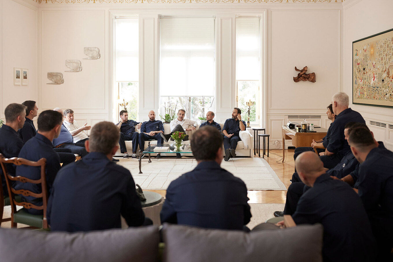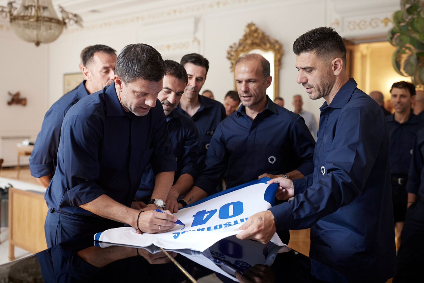 Οι παίκτες της Εθνικής προσέφεραν στον Πρωθυπουργό αναμνηστική φανέλα με τις υπογραφές τους και τον προσκάλεσαν στον φιλικό αγώνα που θα δώσουν με την UEFA All-Stars, ομάδα επιλέκτων των ευρωπαϊκών γηπέδων, με αφορμή τη συμπλήρωση 20 χρόνων από τον θρίαμβο της Ελλάδας, στη γενέτειρα του Otto Rehhagel, το Έσσεν της Γερμανίας, στις 11 Ιουλίου.