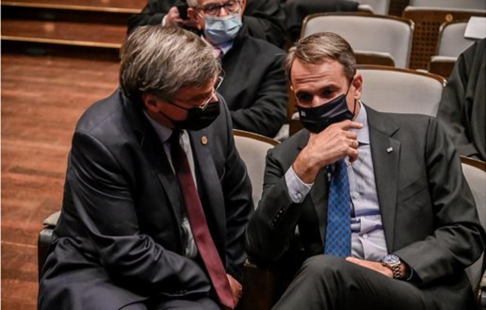 Στο περιθώριο της εκδήλωσης ο Πρωθυπουργός και ο καθηγητής είχαν ένα σύντομο τετ α τετ και μίλησαν για την πορεία της πανδημίας του κορωνοϊού στη χώρα. Ο Κυριάκος Μητσοτάκης φαίνεται να ακούει προσεκτικά τον Σωτήρη Τσιόδρα.