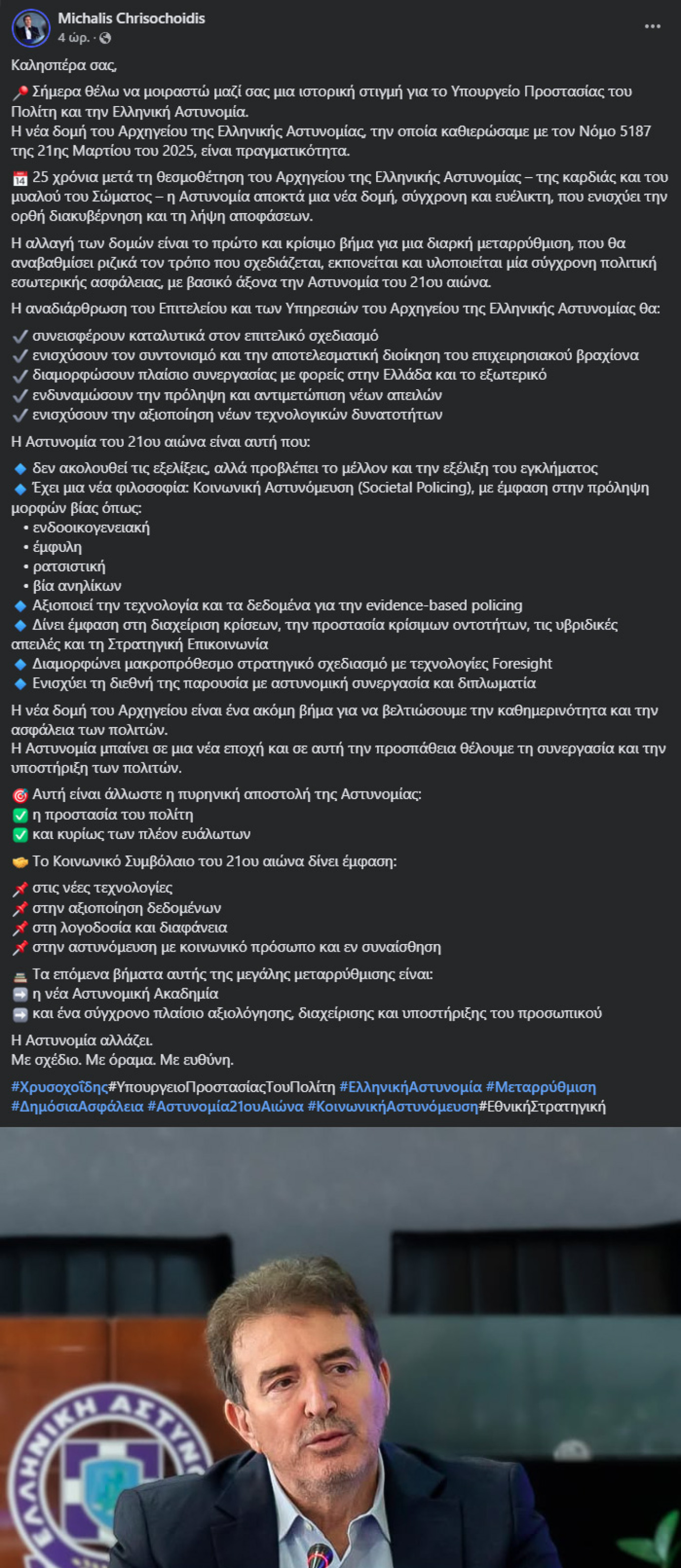 «Τα επόμενα βήματα αυτής της μεγάλης μεταρρύθμισης είναι: η νέα Αστυνομική Ακαδημία και ένα σύγχρονο πλαίσιο αξιολόγησης, διαχείρισης και υποστήριξης του προσωπικού», προαναγγέλλει ο υπουργός Προστασίας του Πολίτη και καταλήγει: «η αστυνομία αλλάζει. Με σχέδιο. Με όραμα. Με ευθύνη».
