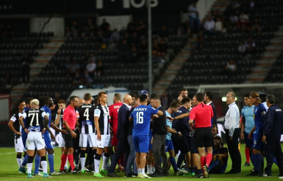 Γεμάτο ένταση το ματς στην Τούμπα, με τον βοηθό του Ραζβάν Λουτσέσκου, Κριστιάνο Μπάτσι να ρίχνει αγκωνιά στον Σιμόν και να τον πετάει κάτω. Μάλιστα, ο Τσαγκαράκης άφησε και με 10 παίκτες τη Λαμία, αποβάλλοντας στις καθυστερήσεις τον Μποάκιε για φάουλ στον Κοτάρσκι. Ο τερματοφύλακας του ΠΑΟΚ αποχώρησε με φορείο, τα… γάντια κατέληξαν στον Σβαμπ (δεν είχαν αλλαγή οι ασπρόμαυροι), με τον ρέφερι να σφυρίζει άρον-άρον τη λήξη της αναμέτρησης.