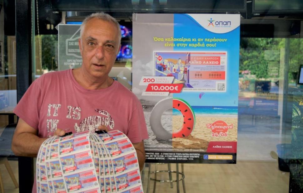 Το Λαϊκό Λαχείο υποδέχεται δυναμικά το καλοκαίρι και οι λαχνοί για την 1η ειδική καλοκαιρινή κλήρωση είναι ήδη διαθέσιμοι στα καταστήματα ΟΠΑΠ. «Οι ειδικές κληρώσεις πάντα προσελκύουν το ενδιαφέρον του κόσμου», τονίζει ο κ. Κωνσταντίνος Κοντογιάννης, υπάλληλος καταστήματος ΟΠΑΠ που βρίσκεται στην οδό Δεληγιάννη 33 & Α. Παπανδρέου 26 στα Μελίσσια, ενώ στην συνέχεια εξηγεί τον μηχανισμό κερδών: «Στην 1η ειδική καλοκαιρινή κλήρωση 200 τυχερές πεντάδες θα κερδίσουν 10.000 ευρώ ανά πεντάδα. Οι πεντάδες αυτές θα προκύψουν μέσα από 20 κληρώσεις. Αρχικά, κληρώνεται ο αριθμός, στη συνέχεια η σειρά και στο τέλος το στοιχείο. Αυτός ο αριθμός που θα προκύψει κερδίζει 10.000 ευρώ στη σειρά που κληρώθηκε, αλλά και στις υπόλοιπες εννέα σειρές. Αυτή η διαδικασία επαναλαμβάνεται άλλες 19 φορές, έτσι ώστε να προκύψουν οι 200 τυχερές πεντάδες».