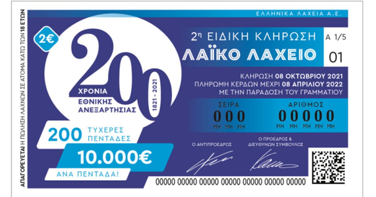 Λίγες ημέρες έχουν απομείνει μέχρι τη νέα ειδική κλήρωση του Λαϊκού Λαχείου «200 Χρόνια Εθνικής Ανεξαρτησίας». Την Παρασκευή, 8 Οκτωβρίου, τρεις ημέρες μετά την καθιερωμένη κλήρωση της Τρίτης, το παιχνίδι θα μοιράσει έπαθλα των 10.000 ευρώ σε 200 νικητές.