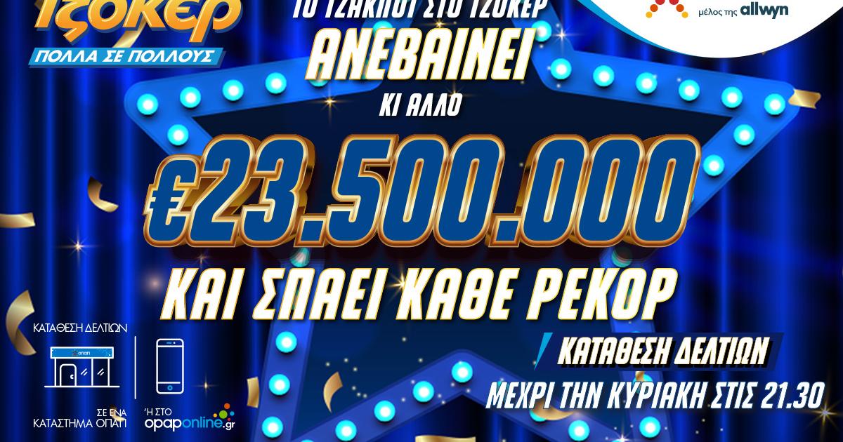 Το θερμόμετρο του ΤΖΟΚΕΡ χτυπάει «κόκκινο», με 23,5 εκατομμύρια ευρώ να περιμένουν έναν ή περισσότερους μεγάλους νικητές στην αποψινή κλήρωση. Το ποσό ρεκόρ, το οποίο έχει συγκεντρωθεί ύστερα από 42 συνεχόμενα τζακ ποτ, αποτελεί το μεγαλύτερο έπαθλο που έχει μοιράσει ποτέ το παιχνίδι στην ιστορία του.