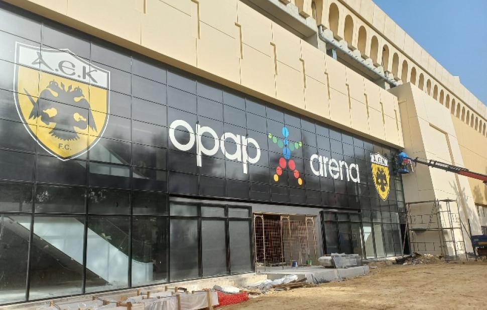 Πλάι στο σήμα της ΑΕΚ, φιλοξενείται πλέον το επίσημο όνομα του γηπέδου, η «OPAP ARENA», με τις εργασίες να εξελίσσονται με ταχύτατους ρυθμούς τις τελευταίες ημέρες και το πρώτο από τα συνολικά τέσσερα σημεία που θα αναγράφεται το όνομα «OPAP ARENA» να έχει ήδη ολοκληρωθεί στην πλευρά που θα βρίσκονται οι θέσεις των επισήμων του γηπέδου.