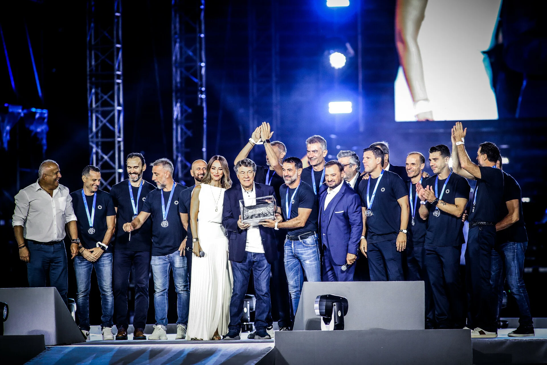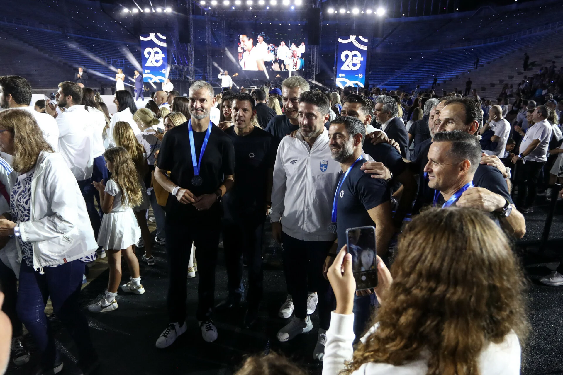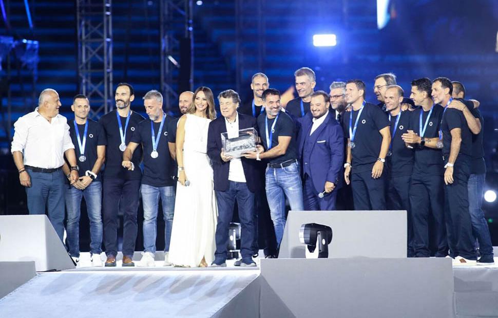 Παρόντες και παλιοί πρωταθλητές και Ολυμπιονίκες στις κερκίδες, αλλά και ο Ότο Ρεχάγκελ -που επέστρεψε στην Ελλάδα- με τον Γιάννη Τοπαλίδη, οι οποίοι τιμήθηκαν για τα όσα προσέφεραν με την κορυφαία ποδοσφαιρική επιτυχία της χώρας μας μαζί με την ομάδα του Euro, η οποία εμφανίστηκε στη σκηνή που στήθηκε για την χθεσινή βραδιά.