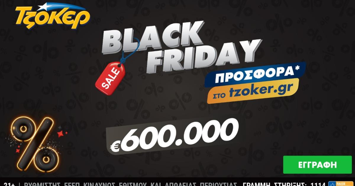 Σε ρυθμό Black Friday βρίσκεται το ΤΖΟΚΕΡ online, εν όψει της κλήρωσης της Κυριακής που μοιράζει 600.000 ευρώ. Οι παίκτες που συμπληρώνουν διαδικτυακά το δελτίο τους μπορούν να βρουν μια μεγάλη προσφορά, για την οποία θα μάθουν περισσότερα κάνοντας εγγραφή στο tzoker.gr ή σύνδεση στον λογαριασμό τους. Για την προσφορά Black Friday ισχύουν όροι και προϋποθέσεις.