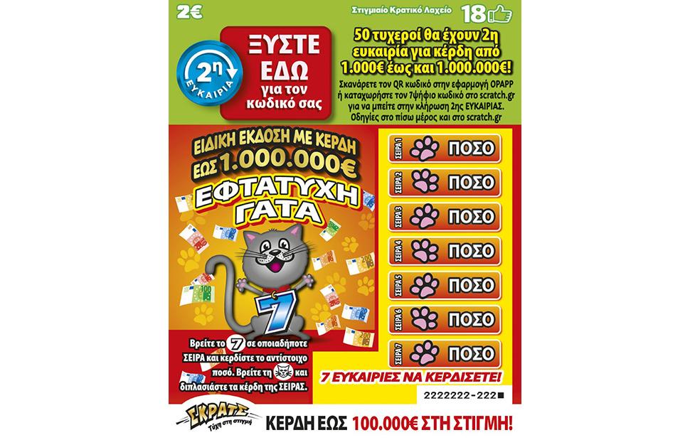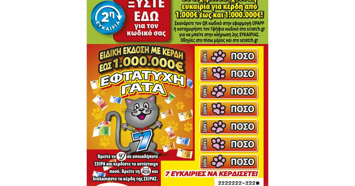 Μια δεύτερη ευκαιρία για κέρδη έως και 1.000.000 ευρώ έχουν οι παίκτες του ΣΚΡΑΤΣ με τα παιχνίδια «ΕΦΤΑΤΥΧΗ ΓΑΤΑ 2η ΕΥΚΑΙΡΙΑ» και «ΕΦΤΑΤΥΧΗ ΓΑΤΑ ΜΕ ΟΥΡΑ 2η ΕΥΚΑΙΡΙΑ». Συγκεκριμένα, όσοι λαχνοί δεν κερδίσουν μπαίνουν σε κλήρωση για να διεκδικήσουν μία θέση ανάμεσα σε 50 τυχερούς που θα έχουν μια 2η ευκαιρία για κέρδη έως και 1.000.000 ευρώ.