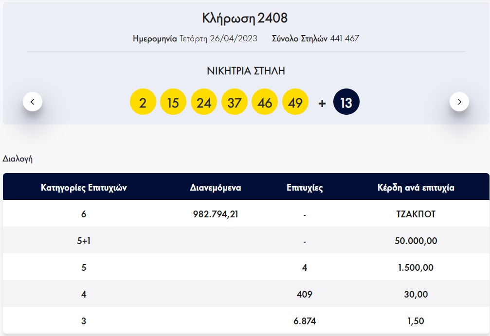 Τζακ ποτ τόσο στην πρώτη, όσο και στη δεύτερη κατηγορία του Λόττο σημειώθηκε στην κλήρωση 2408 της Τετάρτης.