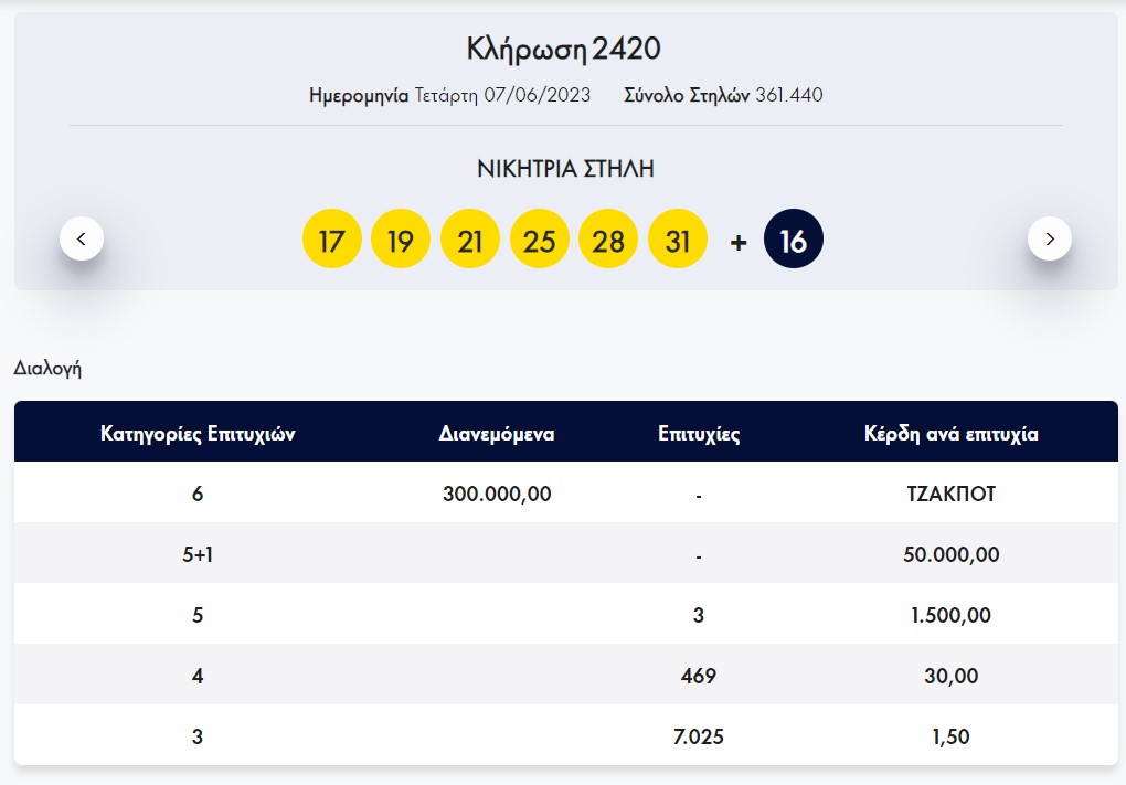 Τζακ ποτ τόσο στην πρώτη όσο και στη δεύτερη κατηγορία του Λόττο σημειώθηκε στην κλήρωση 2420 της Τετάρτης.