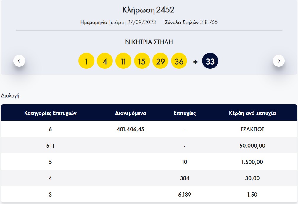 Τζακ ποτ στην πρώτη και στη δεύτερη κατηγορία του Λόττο σημειώθηκε στην κλήρωση 2452 της Τετάρτης.