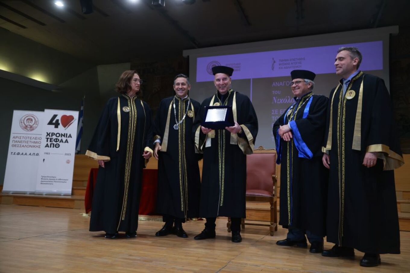 Η τελετή αναγόρευσής του σε επίτιμο διδάκτορα του Τμήματος Επιστήμης Φυσικής Αγωγής και Αθλητισμού του ΑΠΘ, πραγματοποιήθηκε το απόγευμα της στην αίθουσα τελετών του Αριστoτέλειου Πανεπιστημίου Θεσσαλονίκης.