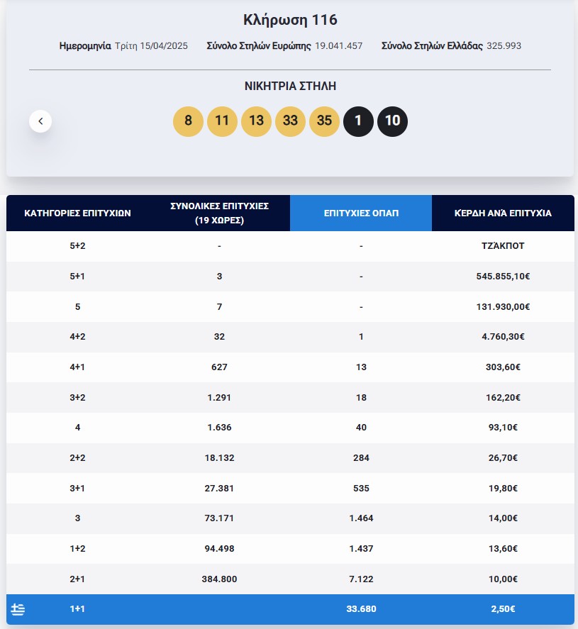 Πραγματοποιήθηκε το βράδυ της Τρίτης η κλήρωση 116 του Eurojackpot.
