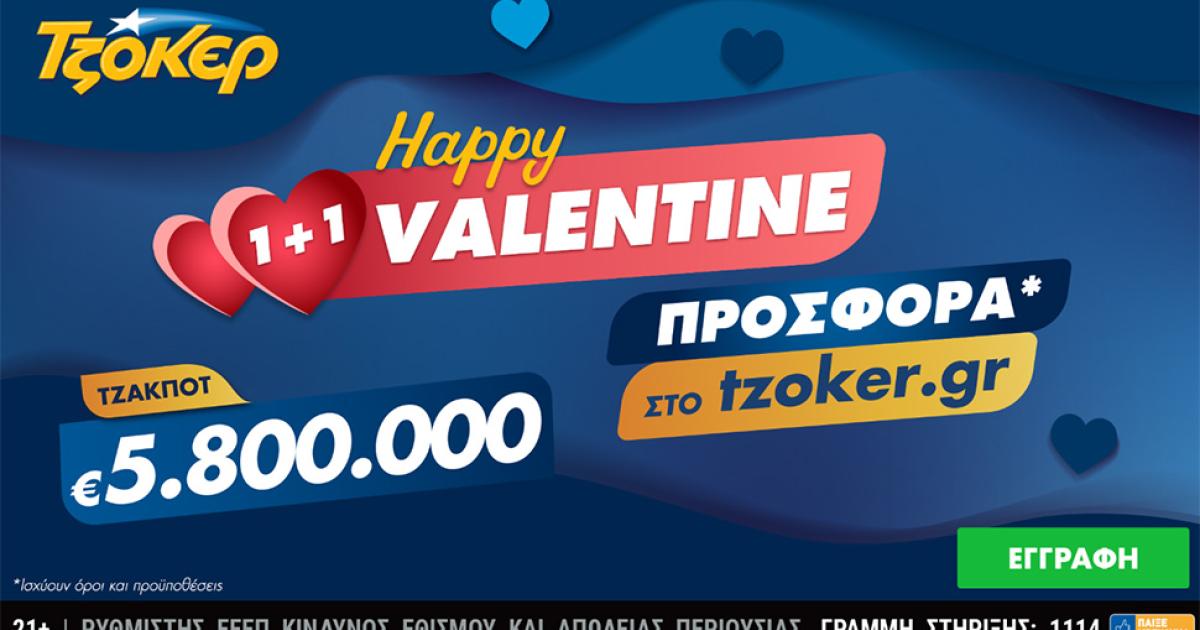 Το ΤΖΟΚΕΡ online βάζει ήδη τους διαδικτυακούς παίκτες στο κλίμα της ημέρας, με την προσφορά “Happy Valentine 1+1”. Για τη συγκεκριμένη προσφορά ισχύουν όροι και προϋποθέσεις. Οι παίκτες μπορούν να μάθουν περισσότερα μπαίνοντας στο tzoker.gr ή στην εφαρμογή ΤΖΟΚΕΡ.