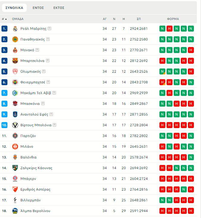 Έτσι λοιπόν η βαθμολογία βρίσκει πρώτη τη Ρεάλ, δεύτερο τον Παναθηναϊκό, τρίτη τη Μονακό και τέταρτη την Μπαρτσελόνα.