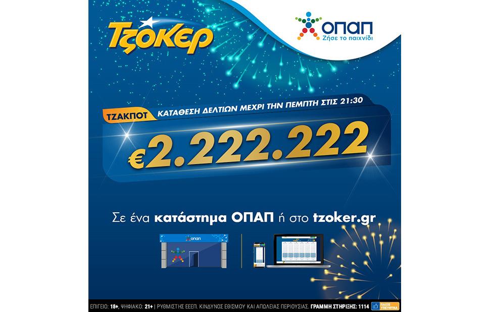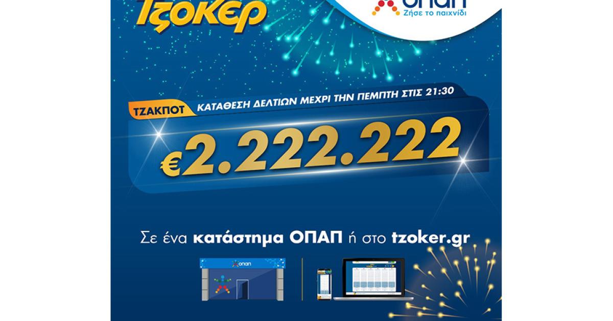 Η προθεσμία για συμμετοχή στην αποψινή κλήρωση είναι έως τις 21:30. Οι παίκτες του ΤΖΟΚΕΡ μπορούν να επισκεφθούν το πλησιέστερο κατάστημα ΟΠΑΠ προκειμένου να συμπληρώσουν και να καταθέσουν το δελτίο τους. Εναλλακτικά, έχουν δυνατότητα να διεκδικήσουν το μεγάλο έπαθλο του παιχνιδιού μέσω διαδικτύου, συμπληρώνοντας το δελτίο τους στο tzoker.gr ή στην εφαρμογή ΤΖΟΚΕΡ.
