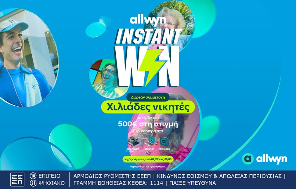 Η Allwyn εγκαινιάζει τη νέα εποχή στη διασκέδαση με το Instant Win, τη συναρπαστική εμπειρία που μοιράζει σε χιλιάδες τυχερούς κέρδη στη στιγμή.