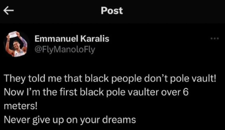 «Μου είχαν πει ότι οι μαύροι δεν κάνουν άλμα επί κοντώ. Τώρα είμαι ο πρώτος μαύρος άλτης με άλμα πάνω από τα έξι μέτρα! Μην εγκαταλείπετε ποτέ τα όνειρά σας», αναφέρει στο μήνυμά του ο Καραλής!