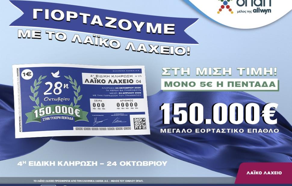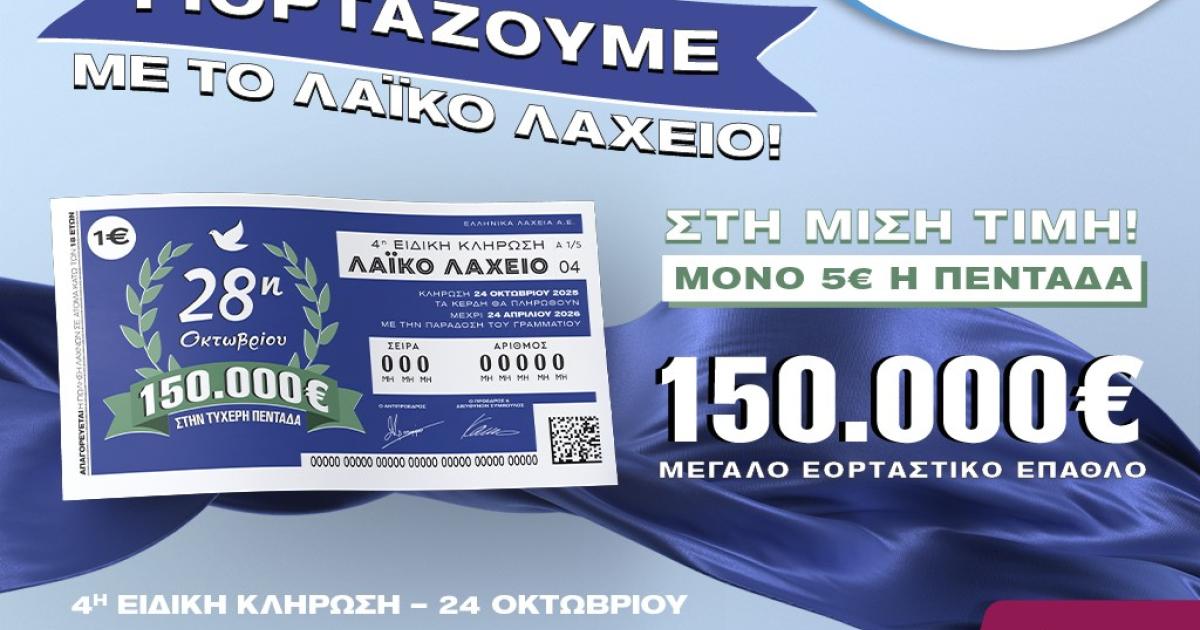 Η 4η ειδική κλήρωση του Λαϊκού Λαχείου για το 2025, θα μεταδοθεί ζωντανά την Παρασκευή 24 Οκτωβρίου στις 19:00, από το κανάλι του ΟΠΑΠ στο YouTube. Εκτός από το μεγάλο έπαθλο των 150.000 ευρώ στην τυχερή πεντάδα, η ειδική κλήρωση για την εθνική επέτειο της 28ης Οκτωβρίου, μοιράζει στους παίκτες και άλλα, μικρότερα έπαθλα.
