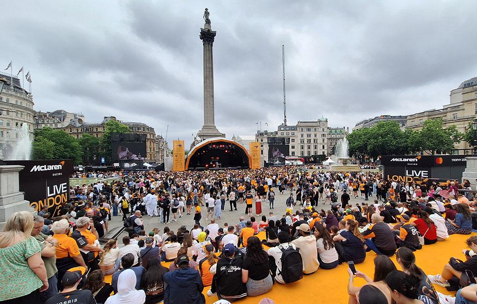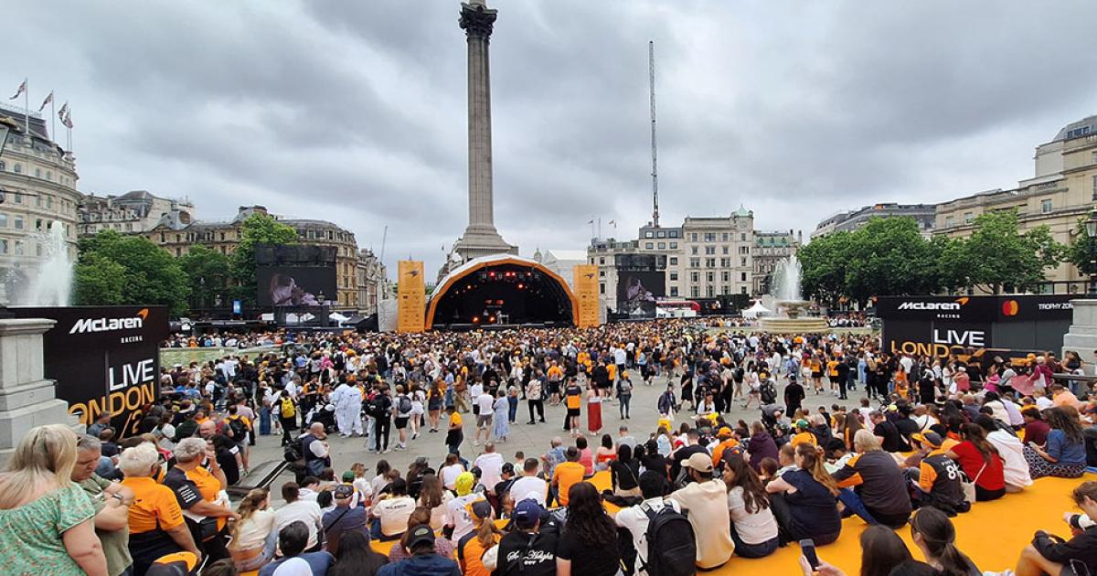 Λίγο πριν το 12ο Grand Prix της χρονιάς στην ιστορική πίστα του Silverstone, η Trafalgar Square στο Λονδίνο «ντύθηκε» στα χρώματα της McLaren με χιλιάδες υποστηρικτές της ομάδας να σχηματίζουν ουρές χιλιομέτρων για να δουν από κοντά τους αγαπημένους τους πιλότους, Lando Norris και Oscar Piastri.